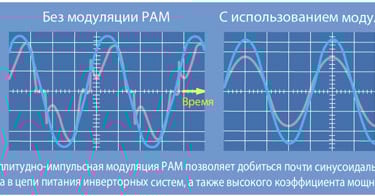Применение амплитудно-импульсной модуляции PAM позволило максимально приблизить ток в цепи питания инверторной системы к синусоидальной форме, устранив более высокие гармоники. Минимальный сдвиг фаз между напряжением и током обеспечивает, практически, активный характер нагрузки и соответствует коэффициенту мощности близкому к идеальному (98%).